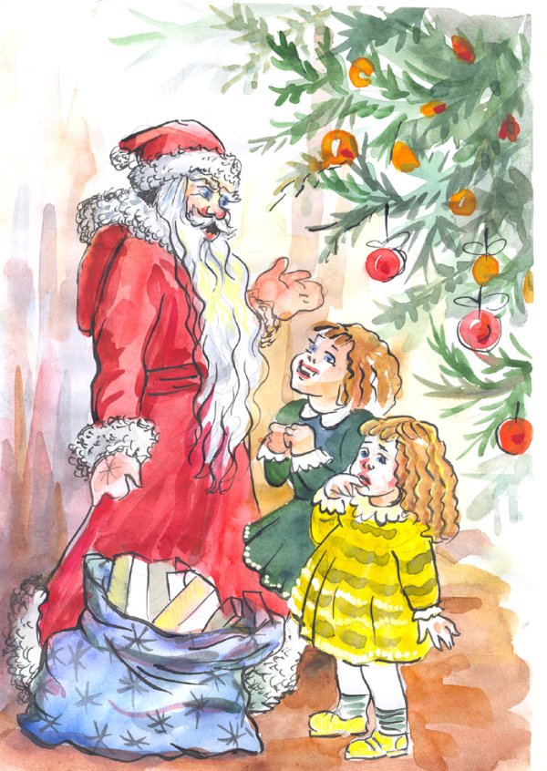 Lucies Augen aber wurden zuerst riesig groß. – Auweia! So was erzählt man doch nicht! – dachte sie. In dem Augenblick aber, als der Weihnachtsmann ihr Schwesterchen zu streicheln begann, blitzten Lucies schlaue Augen. Und als der stattliche Bärtige rief „Das hast du aber fein gemacht!“ und Gaja einen Kuss auf den Kopf gab, wurde es der älteren Schwester klar: – Das ist kein echter Weihnachtsmann! Sondern nur sein Stellvertreter. Er ist nicht aller Sprachen mächtig und verstand nicht, was meine kleine Schwester sagte!